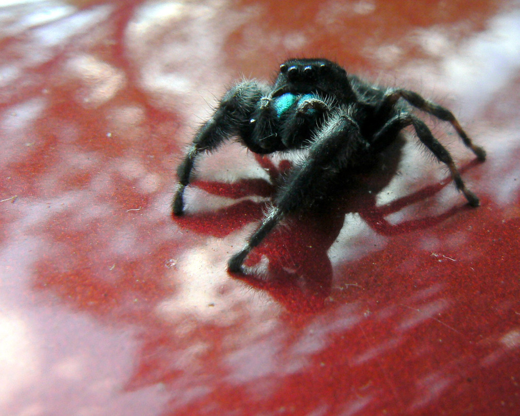 "A cute (and daring) jumping spider on my car" by Benimoto via Flickr, Creative Commons Attribution.
